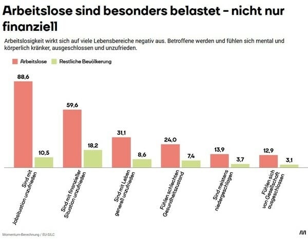 Noch immer haben wir es nicht geschafft, arbeitslosen Menschen ein Leben zu ermöglichen, das sie zumindest vor Ausgrenzung und Krankheit schützt. Auswertungen des Momentum Instituts aus den Daten der Europäischen Union zeigen, welche 6 besonders drastischen Auswirkungen die Arbeitslosigkeit auf betroffene Menschen hat.