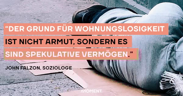 Eine der Auswirkungen zu kleiner Löhne und zu schlechter Sozialleistungen ist Wohnungslosigkeit. In Wien allein drohen derzeit etwa 5.000 Delogierungen. Das ist einerseits eine Folge der Krise, andererseits aber auch eine normale grundlegende Auswirkung unseres Wirtschaftssystem. "Wohnungslosigkeit ist keine Folge von Armut, sondern von Vermögen", sagt der australische Soziologe Jon Falzon vom progressiven Think Tank Per Capita. Er kritisiert die Konzentration von Vermögen in den Händen weniger Menschen, die damit auch auf Dinge spekulieren dürfen, die für andere Menschen zu den Grundbedürfnissen zählen. Der Mythos des neoliberalen Mainstreams würde Obdachlosigkeit als persönlichen Mangel statt gesellschaftliches Problem darstellen. Wer aber nicht verstehe, dass nicht die Menschen auf der Straße das Problem seien, sondern ein politisches und wirtschaftliches System, dass sie auf der Straße landen lasse, könne das Problem auch nicht lösen.