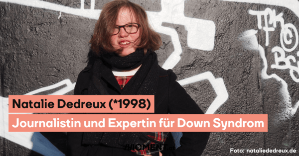Natalie Dedreux, geboren 1998, ist Journalistin und Expertin für das Down Syndrom. Die junge Frau wurde mit Trisomie 21 geboren und arbeitet hauptsächlich beim Magazin Ohrenkuss, bei dem nur Menschen mit Down-Syndrom arbeiten. Aktuell beschäftigt sie sich vor allem mit dem Krieg in der Ukraine. Auf ihrem Blog und bei Instagram könnt ihr von Natalie lesen.