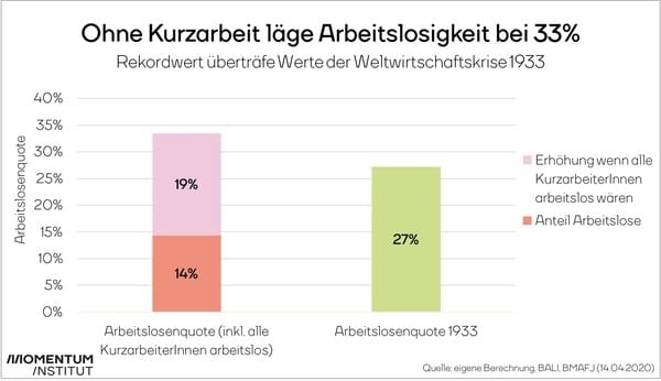 Auch bei uns ist die Arbeitslosigkeit stark gestiegen auf derzeit 14 Prozent. Aber: Knapp 800.000 ÖsterreicherInnen sind derzeit in Kurzarbeit. Gäbe es dieses Hilfsinstrument nicht, hätten wir die höchste Arbeitslosigkeit, die jemals gemessen wurde, höher noch als zur Zeit der Weltwirtschaftskrise 1933.