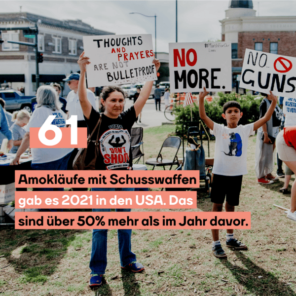 Einer der Gründe ist der leichte Zugang zu Schusswaffen. In den USA sucht man strenge Waffengesetze nämlich vergeblich. Dadurch ist der Erwerb von Schusswaffen unglaublich einfach. Immer wieder fordern deshalb Teile der Zivilbevölkerung und Politik strengere Waffengesetze. Doch die Waffenlobby “National Rifle Association” (NRA) ist mächtig und will Verschärfungen des Waffenrechts um jeden Preis verhindern. Denn der Verkauf von Schusswaffen für den privaten Zweck boomt: Zwischen 2000 und 2020 haben US-amerikanische Waffenhersteller rund 140 Millionen Waffen für den kommerziellen Markt hergestellt.
