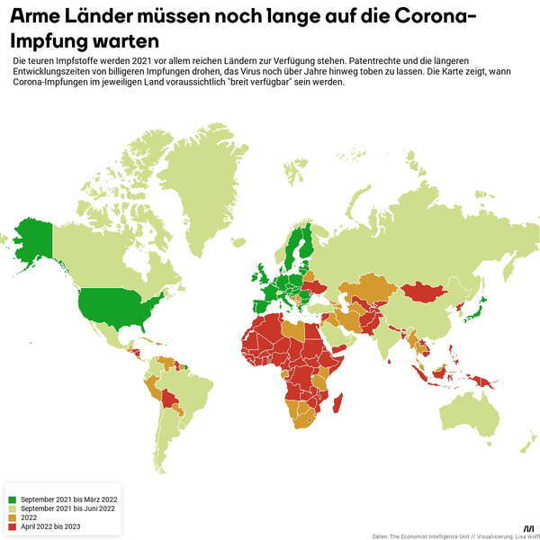 Während sich reiche Industriestaaten hunderte Millionen an teuren Corona-Impfdosen gesichert haben, sind viele ärmere Länder der Welt nicht dazu in der Lage, mit ihren finanziellen Möglichkeiten mitzuhalten. Das zeigt die Karte von The Economist, die wir für dich übersetzt haben.