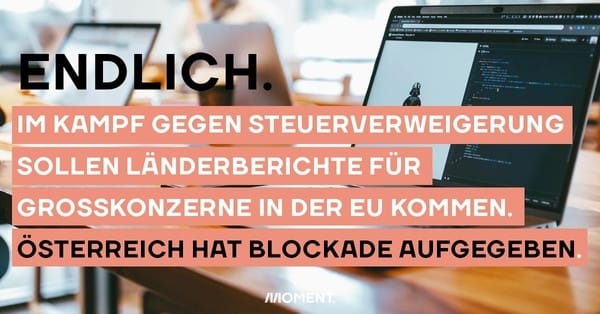 Aus gutem aktuellen Anlass gibts heute eine Nachricht gratis obendrauf: Die EU verschärft den Kampf gegen Steuerverweigerung von Großkonzernen. Österreich gehörte lange zu den Staaten, die wichtige Maßnahmen blockieren. Gestern hat man im EU-Ministerrat die Blockade aber endlich aufgegeben und einem Vorschlag der EU-Kommission zugestimmt. Wenn alles gut geht, müssen Großkonzerne künftig in Länderberichten öffentlich machen, wo sie ihre Gewinne machen. Das soll es ihnen erschweren, sie in Steuersümpfe zu verschieben. Die Maßnahme wird seit langem von ExpertInnen gegen Steuerhinterziehung und andere Formen der Steuervermeidung gefordert. Die Entwicklung ist deshalb sehr erfreulich. Nun wird das EU-Parlament sich in den Vorschlag einbringen. Es wird dabei noch entscheidend, wie die Details der Maßnahmen ausgestaltet werden, sagen BefürworterInnen.