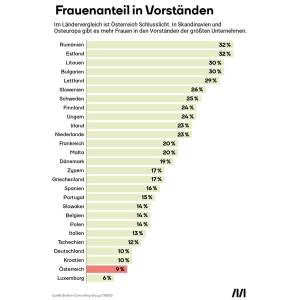 In den obersten Chefetagen der großen Unternehmen gibt es immer noch viel mehr Männer als Frauen. Eine Studie der Bosten-Consulting-Group zeigt nun, wie das Verhältnis in den Vorständen der jeweils größten Unternehmen in Europa verteilt ist. Österreich schneidet in dem Ranking schlecht ab, sehr schlecht sogar. Wir liegen mit einer Frauenquote von 8,9 Prozent auf dem 26. Platz. Das ist der vorletzte. Besser schneiden die skandinavischen und osteuropäischen Länder ab. Doch bei allen Ländern gilt: Es könnte besser sein.
