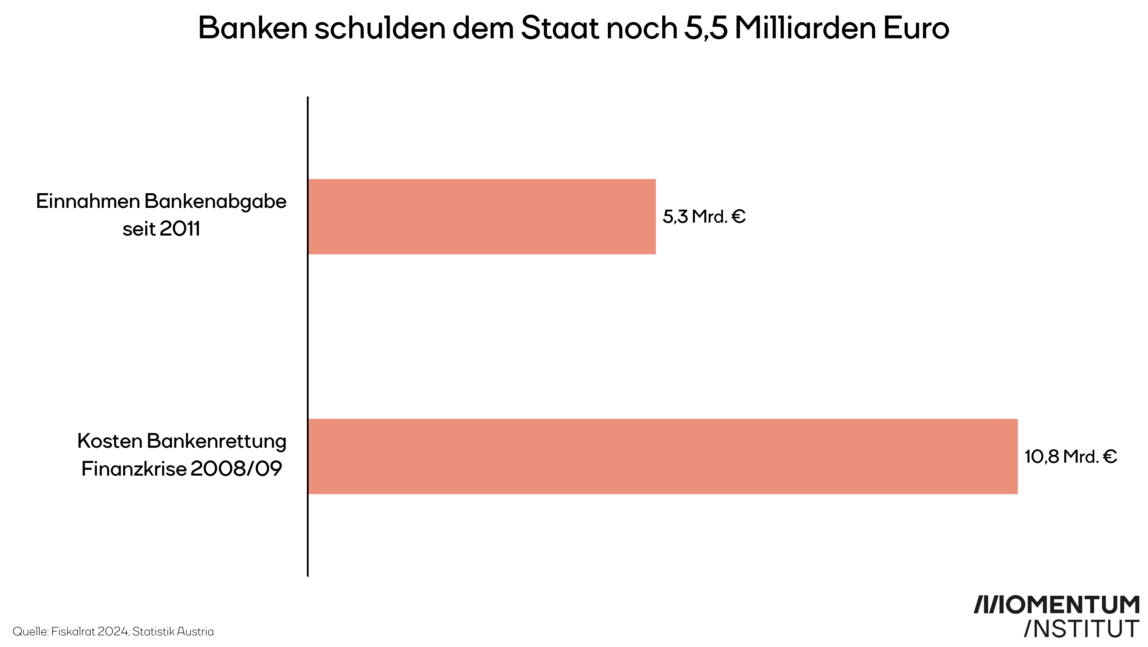 Die Rettung der Banken nach der Krise 2008 hat Steuerzahler:innen in Österreich insgesamt 10,8 Milliarden Euro gekostet. Seither haben die Banken über eine Abgabe zwar 5,3 Milliarden zurückgezahlt, doch 5,5 Milliarden fehlen noch immer. Für künftige Krisen gibt es weiterhin keinen Polster.