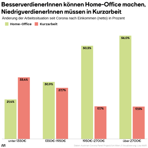 Die Krise trifft auch sonst nicht alle gleich. Menschen mit niedrigen Einkommen können viel seltener ins sicherere Home-Office wechseln und müssen weiterhin an ihren Arbeitsplatz fahren. Und gleichzeitig sind ausgerechnet die, die ohnehin schon weniger Einkommen haben, viel öfter von Einkommensverlusten durch Kurzarbeitsmodelle betroffen. Das zeigen erste Ergebnisse des Austrian Corona Panel Projects der Uni Wien.