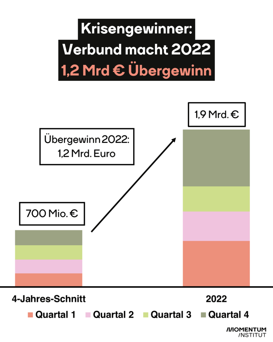 Energiekonzerne zählen zu den Krisengewinnern. So auch der größte Stromerzeuger Österreichs: Der Verbund. Der hat im vergangenen Jahr 1,9 Mrd. Euro Gewinn gemacht. Vergleicht man den Gewinn mit dem Durchschnitt der vergangenen vier Jahre, ergibt sich ein Plus von 178 Prozent. Das bedeutet einen Übergewinn von 1,2 Mrd. Euro, schreibt das Momentum Institut.