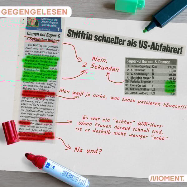 Die Ski-Wahrheit ist einfach. Wer schneller ist, ist besser. Bei der Ski-WM in Cortina passierte etwas nicht so Häufiges: Männer und Frauen führen einen Lauf am selben Kurs. Manche stachelt der Vergleich zu seltsamen Verrenkungen an - auch Ex-Skifahrer Marc Girardelli in der "Heute". Dabei wird der echte Unterschied (nur 2 Sekunden) kleingeredet. Das passiert bei Leistungen von Frauen häufig. Unser Kommentar geht näher darauf ein.