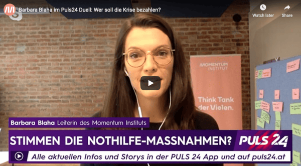 Noch mitten in der Krise beginnt bereits die Diskussion darüber, wer denn das alles bezahlen soll. Darüber diskutiert Momentum Institut-Chefin Barbara Blaha (ja, ok, ich) mit Barbara Kolm auf Puls24 - und ich stelle gleich mal die Gretchenfrage. Die Kosten der Krise tragen derzeit all jene, die schuldlos ihren Job verloren haben und mit nur mehr der Hälfte ihres Einkommens leben müssen. Die Frage lautet daher doch: Ist unser Hilfspaket nicht eigentlich zu klein gedacht, wenn wir Hunderttausende im Regen stehen lassen? Hier das Gespräch zum Nachschauen.