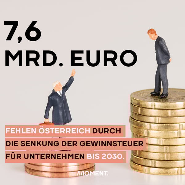 Die ökosoziale Steuerreform gerät durch die Regierungskrise in den Hintergrund. "Das darf nicht passieren", dachte sich das Momentum Institut und lieferte uns folgende Zahl, die, außer Unternehmer:innen, vielen bitter aufstoßen dürfte. Durch die Senkung der Körperschaftssteuer fehlen dem Staat Österreich bis 2030 nämlich 7,6 Milliarden Euro. Viel Geld, das vielleicht besser in Bildung, Pflege und Klimaschutz als in die Gewinne großer Unternehmen investiert wäre.