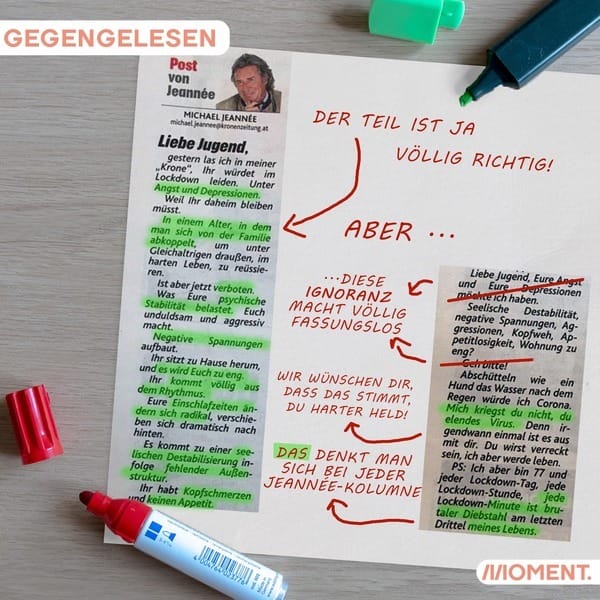 Die psychische Gesundheit von jungen Menschen leidet unter der Corona-Krise, dem Lockdown, der unsicheren Zukunft. Das ist finde ich verständlich. Wenige verstehen kann ich allerdings, was das im Krone-Kolumnisten Michael Jeannée auslöst. Seine Ignoranz gegenüber der psychischen Gesundheit junger Menschen überschreitet eine Grenze. Wir sagen auch "Geh bitte!" - aber zur gesamten Kolumne von Jeannée.
