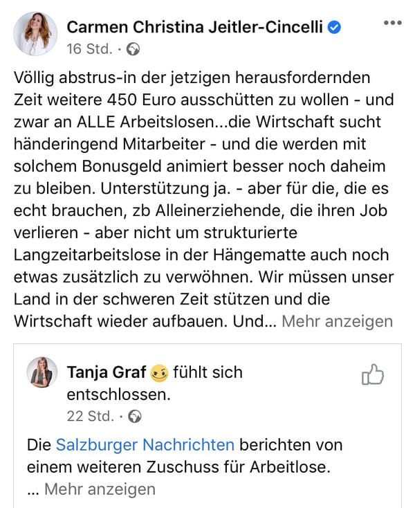 Kogler hatte seine Ankündigung offenbar nicht mit ÖVP-HinterbänklerInnen abgesprochen, denn Jeitler-Cincelli zitierte in ihrem Post auch ihre ÖVP-Parlamentskollegin Tanja Graf. Die bläst davor schon in ein ähnliches Horn: "Als Unternehmerin hinterfrage ich kritisch: wie kann sich Arbeit so noch lohnen?", schrieb Graf. Die einfache, wenn auch verrückte Antwort übrigens: durch gute Löhne und gute Arbeitsbedingungen. Das könnte man als Unternehmerin schon wissen.