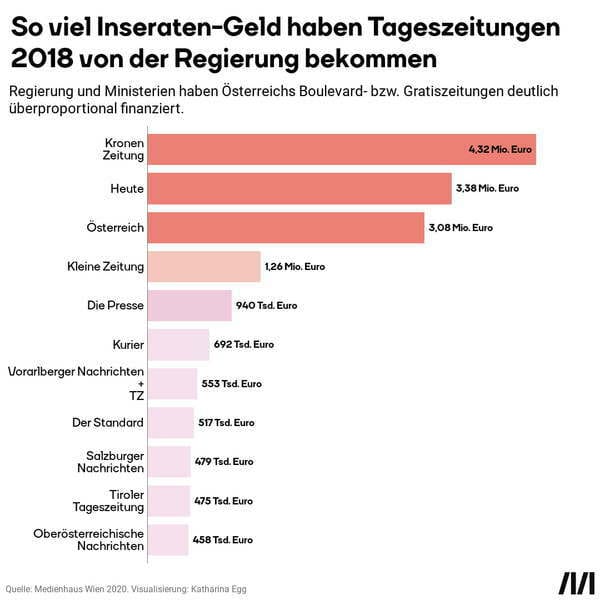 Nach der skandalösen Berichterstattung von OE24.at und Kronen Zeitung zum Terroranschlag wollten mehrere Unternehmen keine Werbung mehr in den Boulevardmedien schalten. Nur knapp zehn Tage nach der Ankündigung folgte dann der Rückzug. Doch nicht nur private Unternehmen füttern die österreichischen Zeitungsriesen indirekt mit Inseraten-Geld: Auch Regierung und Ministerien lassen sich Werbung in Zeitungen einiges kosten. Davon profitiert vor allem die Boulevardzeitung Österreich und zwar unverhältnismäßig stark, wie eine Studie vom Medienhaus Wien zeigt.