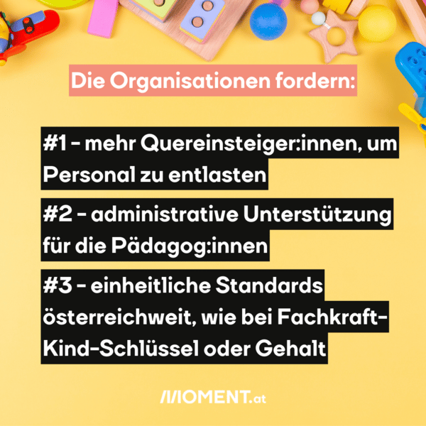 Sie fordern Verbesserungen der Arbeitsbedingungen für das pädagogische Personal. Die als "Kindergartenmilliarde" bezeichneten 287,5 Millionen Euro, die die Bundesregierung in den kommenden 5 Jahren zusammengenommen zusätzlich in Österreich ausgeben will, seien nicht einmal annähernd dazu geeignet, die Personalprobleme zu lösen.