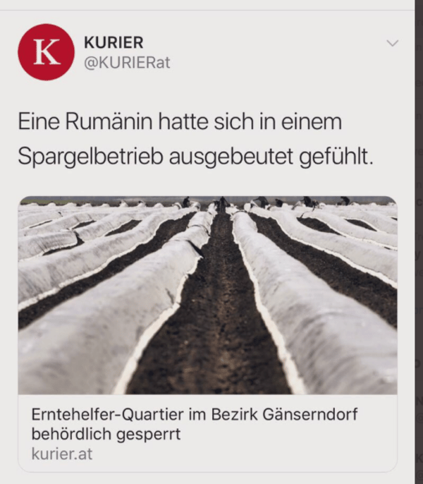 Wisst ihr noch, die ErntehelferInnen, die wir während Corona eingeflogen haben? Damit wir auf unseren Spargel nicht verzichten müssen, haben rumänische Frauen wochenlang im Akkord gearbeitet. 150 Euro Wohngeld wurde ihnen vom Lohn dann noch für die schimmelige Matratze abgezogen, auf der sie schlafen mussten. Der Falter hat die Zustände aufgedeckt, nun hat auch der Kurier darüber berichtet, in etwas eigenwilliger Weise.