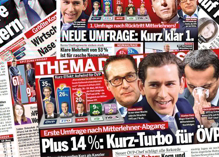 Passende Umfragen, die Sebastian Kurz gut aussehen lassen und seine Gegner:innen schlecht. Platziert in Medien der Fellner-Gruppe und finanziert mittels Scheinrechnungen durch Steuergeld.