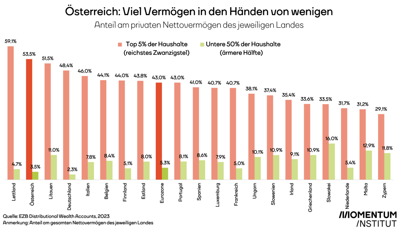 Stellt man sich Österreich als Dorf mit zwanzig Einwohner:innen vor, dann besitzt eine Person die halbe Ortschaft. In nur einem Land der Eurozone haben die reichsten fünf Prozent einen höheren Anteil am Vermögen. Umgekehrt besitzt die Hälfte der Einwohner:innen – zehn Menschen – fast nichts. Ihnen zusammen gehört weniger als einer von 28 Euro an Vermögen. Damit liegt Österreich auf dem vorletzten Platz im Eurozonen-Vergleich.