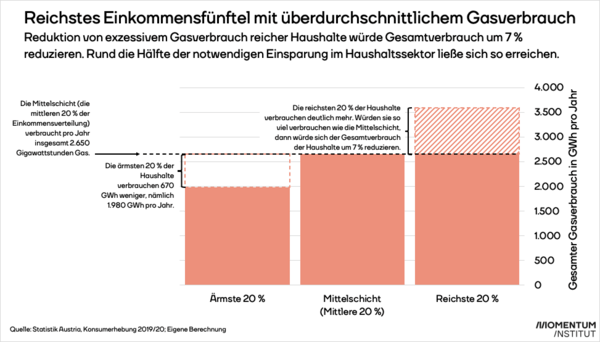 Das Momentum Institut hat berechnet, dass Österreichs Haushalte insgesamt schon um 7% weniger Gas benötigen würden, würde nur das reichste Fünftel seinen Verbrauch auf den der mittleren Haushalte senken. Für Deutschland hat ein Forscher der Universität Leeds errechnet, dass sich der Gesamtenergieverbrauch in Deutschland sogar um 26% verringern ließe, würde niemand mehr Energie als die mittleren Haushalte verbrauchen.