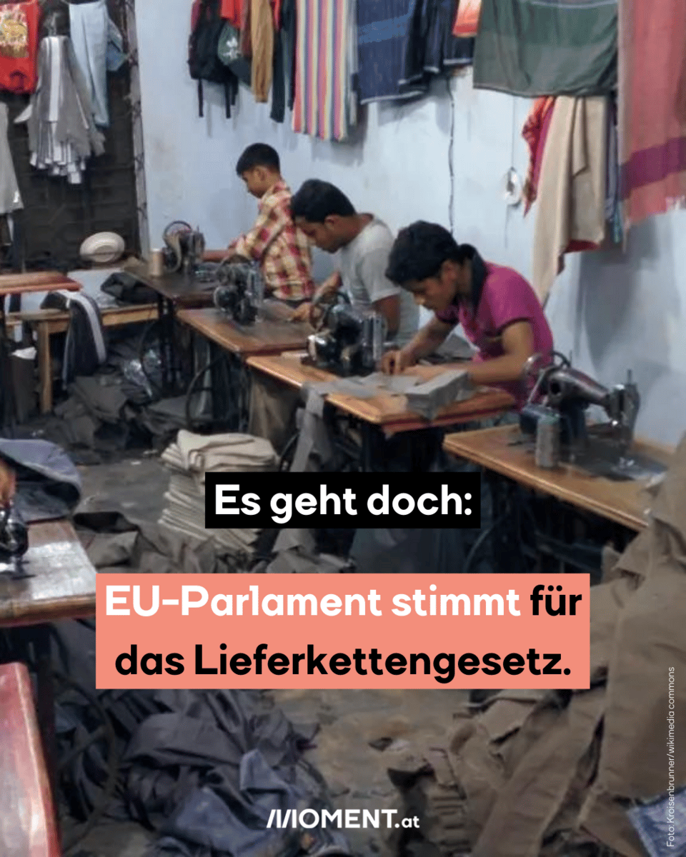 Es ist durch. Das EU-Parlament stimmt für das Lieferkettengesetz. Es soll Unternehmen verpflichten, in ihrer weltweiten Produktion Menschenrechte zu wahren und die Umwelt nicht zu schädigen. Wie MOMENT.at berichtete, hatte sich die konservative EVP-Fraktion kurz vor dem Tag der Abstimmung quergestellt und zahlreiche Änderungen am Gesetz gefordert. Damit wäre das EU-Lieferkettengesetz verwässert worden und drohte sogar, zu scheitern. Doch das Parlament stimmte jetzt für den im April verabschiedeten Vorschlag des Rechtsausschusses. Demnach soll die Richtlinie für große Firmen ab 250 Mitarbeiter:innen und mehr als 40 Millionen Euro Nettoumsatz im Jahr gelten.