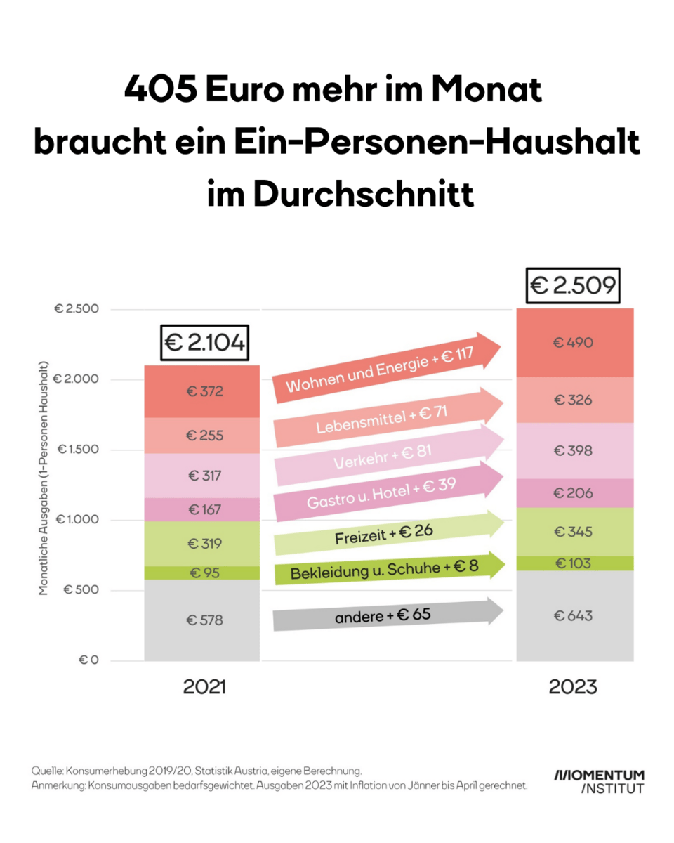 Auch wenn die Teuerungsrate sinkt, das Leben ist heute teurer als noch vor zwei Jahren. Wie viel teurer hat das Momentum Institut berechnet. Ein Ein-Personen-Haushalt muss heute im Schnitt 405 Euro mehr im Monat zahlen als 2021. Waren es vor zwei Jahren durchschnittlich 2.100 Euro im Monat, sind es heute 2.509 Euro.