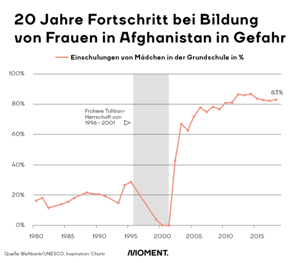 Nach dem Sturz der Taliban hat Afghanistan in den vergangenen 20 Jahren in der Bildungsfrage große Fortschritte gemacht. Daten der Weltbank zeigen, dass die Zahl der Mädchen, die in Afghanistan in die Grundschule gingen, von 0% im Jahr 2001 auf über 80 % im Jahr 2018 gestiegen ist.