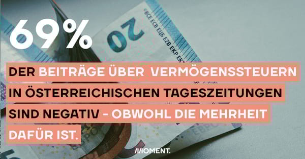 Eine aktuelle Recherche des Momentum Instituts zeigt jedoch, dass in österreichischen Tageszeitungen auffallend negativ darüber geschrieben wird. Dazu wurden Artikel aus den Jahren 2005-2020 analysiert, die in fünf Zeitungen erschienen sind. In allen Qualitätsmedien überwog dabei die ablehnende Haltung gegenüber Vermögenssteuern. 69% der Berichte waren negativ, nur 22% zustimmend. Die restlichen 9% waren ausgeglichen. Besonders extrem war die Berichterstattung in der “Presse”, in der 82% der Artikel negativ waren. Aber sogar im liberalen “Standard” lag dieser Wert bei 52%. Die ganze Recherche kannst du hier nachlesen.