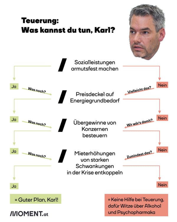 MOMENT arbeitet unabhängig von Parteien, Banken und Konzernen. Damit das möglich ist, brauchen wir die Hilfe möglichst vieler Menschen. Alle Möglichkeiten, uns zu unterstützen, findest du hier. Jeder Euro macht einen Unterschied. Danke!