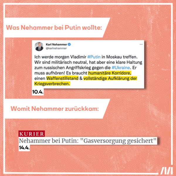 Bundeskanzler Nehammer stattete Wladimir Putin Anfang der Woche einen Besuch ab. In einem Tweet forderte er zuvor humanitäre Korridore, einen Waffenstillstand und die Aufklärung der Kriegsverbrechen Russlands. All das wolle er gegenüber Putin ansprechen.