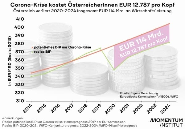 Mit 51 Milliarden Euro stützen wir jetzt die Wirtschaft. Eine Analyse des Momentum Instituts zeigt, dass das nicht reicht für einen Aufschwung. Bis 2024 verliert jeder Mensch in Österreich infolge des Corona-Einbruchs durchschnittlich 12.800 Euro. Zusätzliche zielgerichtete Investitionen in Klimaschutz und den Arbeitsmarkt könnten wieder für Wachstum sorgen.