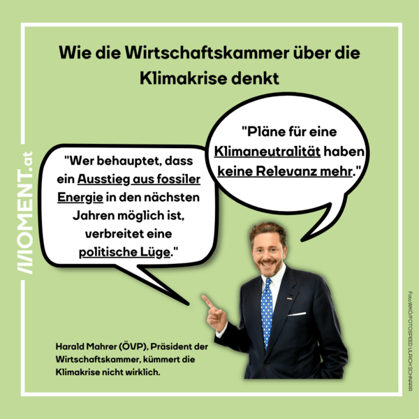 An den Klimazielen solle man festhalten, meint er laut Medienberichten. Nur um vor Journalist:innen auch zu sagen, die bisherigen Plänen zur Bewältigung der Klimakrise seien "nicht mehr relevant". Dabei sind die österreichischen Vorhaben laut allen Expert:innen viel zu wenig, um die Klimakatastrophe abzuwenden. Für Mahrer ist der Ausstieg aus fossilen Energiequellen in den nächsten Jahren jedenfalls "eine politische Lüge". Damit stimmt er in ähnliche Wortmeldungen ein, die kürzlich aus der Industriellenvereinigung zu hören waren.