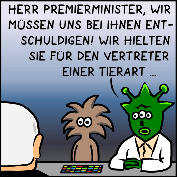 Die Außerirdischen haben mittlerweile erkannt, dass Premierminister Plenk ein intelligentes Wesen ist. So ganz überzeugt sind sie allerdings dann doch nicht. Der neue Hebel der Macht ist da: