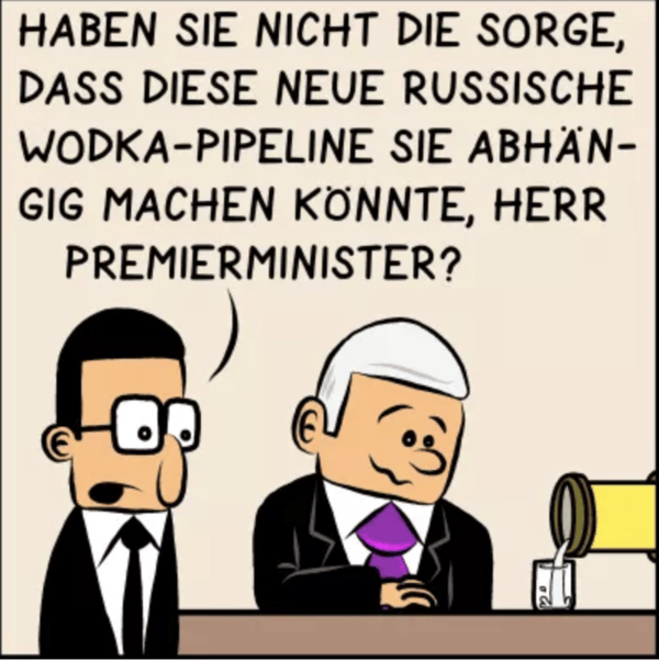 Ob die russische Wodka-Pipeline Premierminister Plenk wirklich guttun wird? Der hat im neuen Hebel der Macht keine Bedenken. Gezeichnet von Rafael Buchegger.