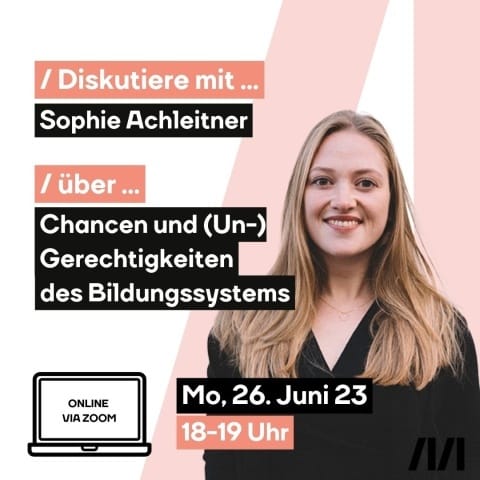 Am 26. Juni gibt es ein Webinar mit Ökonomin Sophie Achleitner vom Momentum Institut. Sie möchte mit dir über Chancen und (Un)Gerechtigkeiten des Bildungssystems diskutieren. Interesse? Hier geht's zur Anmeldung.