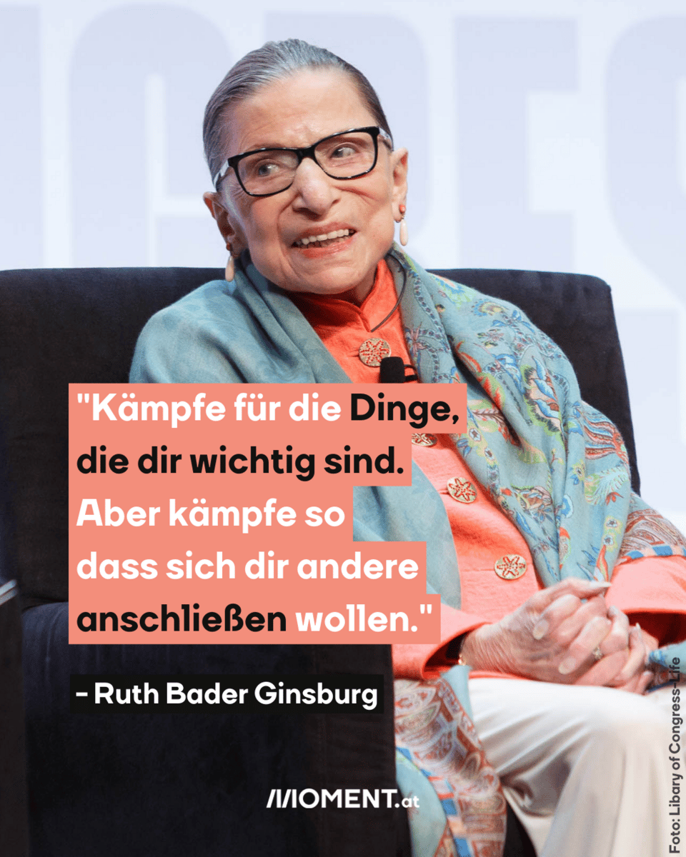 Ginsburg wurde 1933 in Brooklyn geboren. Sie war Teil einer jüdischen Familie. Die Eltern ihrer Mutter stammten aus Polen, der Vater wanderte aus Odessa in der heutigen Ukraine ein. Im Jahr 1993 nominierte der damalige demokratische Präsident Bill Clinton sie als Richterin am Supreme Court. Im Jahr 2015 wurde sie bei der Verleihung der Radcliffe Medaille der Harvard University gefragt, was sie Frauen heute mit auf den Weg geben würde. „Kämpfe für die Dinge, die dir wichtig sind. Aber kämpfe so, dass sich dir andere anschließen wollen“, antwortete Ginsburg.