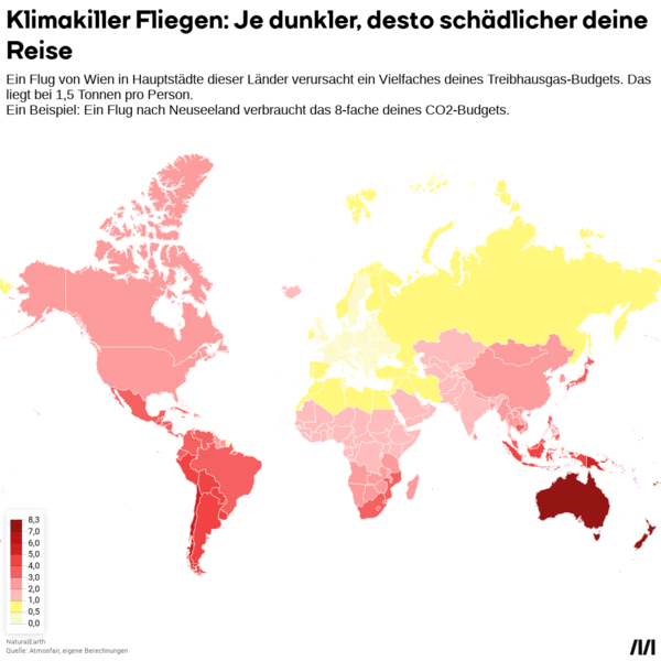 Das persönliche Klimabudget beträgt für jeden Menschen rund 1,5 Tonnen Emissionen. Durch diesen Verbrauch könnte laut IPCC das 1,5 Grad-Ziel mit hoher Wahrscheinlichkeit erreicht werden. Davon sind wir aber noch weit entfernt: In Österreich hat jede Person 2021 im Schnitt 8,2 Tonnen an Treibhausgasemissionen ausgestoßen. Ein Flug von Wien nach Neuseeland verursacht mit 12,5 Tonnen mehr als eineinhalb Mal so viele Emissionen.