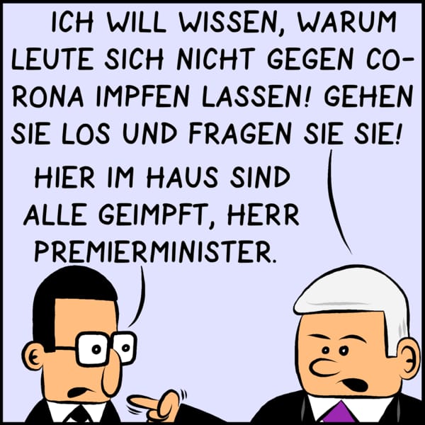 Auch dem Premierminister macht der stagnierende Impffortschritt Sorgen. Er schickt Brommel los, um die ungeimpften Menschen zu fragen, wieso sie sich nicht impfen lassen wollen. Aber wo findet man diese?