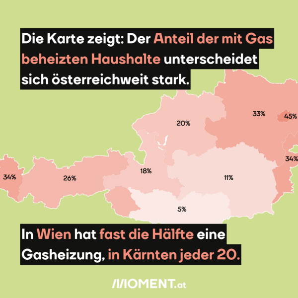 Die Gaspreise steigen und steigen. Wer mit Gas heizt, spürt das jetzt besonders. In fast einer Million Haushalte kommt die Wärme aus der Therme. Von Bundesland zu Bundesland unterscheidet sich der Anteil der gasbeheizten Haushalte enorm - siehe die Karte unten. Und: 500.000 dieser Haushalte mieten ihre Bleibe. Sie haben kaum Einfluss darauf, ob bei ihnen die Gasheizung gegen eine andere getauscht wird. Denn das entscheidet die Vermietung. Und die hat wenig Anreiz dafür. Denn die hohen Gaspreise zahlen die Mieter:innen. Was helfen kann: Das Momentum Institut schlägt Mietabschläge in Wohnungen mit Gasheizung vor. Wer seine Miete senken muss, überlegt sich das mit dem Heizungstausch vielleicht noch mal.