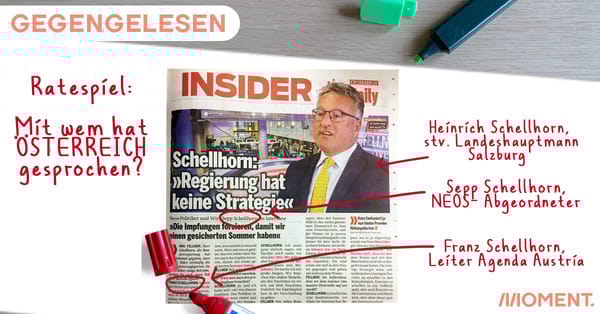 Gleiche Nachnamen bei verschiedenen Personen können in Österreich bekanntlich zu Verwirrungen führen. Ein neuer Rekord: Die Tageszeitung "Österreich" hat gestern gleich drei Personen mit dem Nachnamen Schellhorn in einem Text zu einem zusammengemixt. Das Interview hat anscheinend Sepp Schellhorn gegeben. Er ist Neos-Mandatar. Im Namensfeld ist jedoch die Rede von seinem Bruder: Franz Schellhorn, Leiter der neo-liberalen Denkfabrik Agenda Austria. Und am Titelbild ist Heinrich Schellhorn abgebildet, er ist Grünen-Politiker und der stellvertretende Landeshauptmann von Salzburg. Hier sind eindeutig zu viele Schellhorns in einem Text.