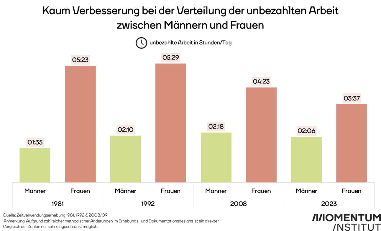 Unbezahlte Arbeit ist seit 40 Jahren unverändert Frauensache. Mit 63% schultern Frauen nach wie vor den Löwenanteil an Betreuungspflichten, Hausarbeit und Pflege. Seit der ersten sogenannten Zeitverwendungserhebung 1981 gibt es wenig Veränderung hin zur fairen Verteilung der unbezahlten Arbeit zwischen Männern und Frauen. Hätte man Frauen in Österreich für ihre unbezahlten Arbeitsstunden entlohnt, hätte ihnen das zusammen im Jahr 2022 etwa 57 Milliarden Euro eingebracht. Würde die unbezahlte Arbeit von Männern und Frauen in die Wirtschaftsleistung einbezogen, würde sie insgesamt um 22 Prozent wachsen. Mehr dazu liest du hier.