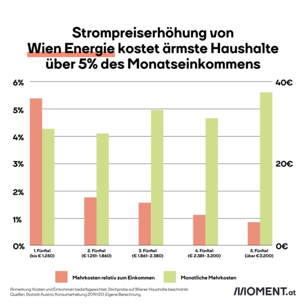 Weil wir insgesamt jetzt noch zu wenig Gummibärchen-Windkraft haben, steigen in Niederösterreich und Wien ab 1. September wieder Strompreise an. Im Schnitt müssen Wiener Haushalte dann 36 Euro mehr pro Monat für Strom ausgeben. Besonders belastet diese Erhöhung arme Menschen. 5% ihres Einkommens wird sie kosten, berechnet das Momentum Institut. Der Großteil der Bevölkerung braucht im Alltag ähnlich viel Strom und zahlt nun ähnlich hohe Geldbeträge zusätzlich. Nur die reichsten Haushalte verbrauchen deutlich mehr.
