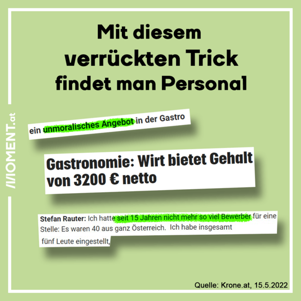 Österreichweit klagen Unternehmen seit Monaten immer wieder in den Medien: Sie finden einfach keine Angestellten. Keine Ahnung, was man da tun kann. Sie hätten ja alles probiert. Ein Kärntner Gastronom hat nun das antike Rätsel mit einer kreativen Idee gelöst. Offenbar reagiert das unerforschte Wesen der Arbeitnehmer:innen darauf, ihm gute Löhne anzubieten. Die "Kronen Zeitung" nennt das - hoffentlich augenzwinkernd gemeint - ein "unmoralisches Angebot". Der Gastronom erzählt dort im Interview, er habe so viele Bewerber:innen gehabt wie noch nie - und dass er dafür aus der Branche auch angefeindet wurde. Der verrückte Trick muss sich also wohl erst noch herumsprechen.