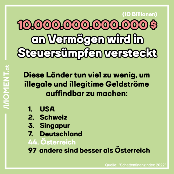 Auf dem schlechtesten Platz liegen zum ersten Mal die USA, gefolgt von der Schweiz und Singapur. Deutschland landet auf dem 7.-schlechtesten Platz. Österreich (44.) ist ebenfalls im schlechtesten Drittel der 141 bewerteten Gebiete. Am schlechtesten ist es hierzulande um Transparenz bei Eigentum und Unternehmen bestellt. Selbst das, was man von diesen Dingen weiß, ist nicht oder nicht kostenfrei einsehbar - etwa das Firmen- und Grundbuch oder im Register der Eigentümer:innen von Unternehmen, Stiftungen und Treuhandschaften.