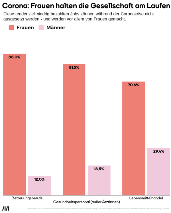 Zuhause bleiben und Abstand halten - wer kann, hält sich an die Empfehlungen von ExpertInnen und Regierung. Doch manche Jobs müssen nun mal gemacht werden. Auffällig ist, dass diese Jobs hauptsächlich Frauen machen, die auch noch schlecht bezahlt werden.