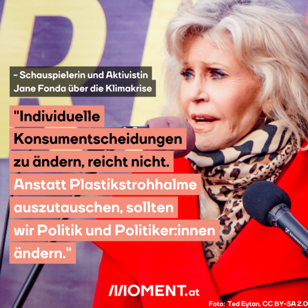 Dabei geht es nicht darum, einzelne Konsumentscheidungen zu treffen: "Wir müssen weiter gehen, schneller. Anstatt Strohhalme und Glühbirnen auszutauschen, müssen wir uns darauf konzentrieren, Politik und Politiker:innen zu ändern", schreibt Fonda.