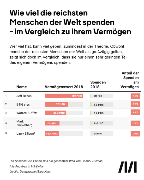 Ab und zu taucht eine Schlagzeile auf, wie viele Millionen oder gar Milliarden die Reichsten der Reichen spenden würden. Diese Zahlen sind beeindruckend, sind doch die Spendensummen weit mehr, als die allermeisten von uns jemals verdienen werden. Setzt man sie allerdings ins Verhältnis zum gesamten Vermögen, sehen die Spender doch ganz klein aus.