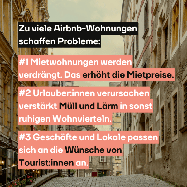Was erst einmal ganz nett klingt, kann zum Problem werden - vor allem für Großstädte. In Barcelona oder Lissabon sind ganze Airbnb-Viertel entstanden. Dadurch werden heimische Mieter:innen aus den Vierteln verdrängt. In Wohnvierteln entstehen plötzlich Touri-Shops und überteuerte Restaurants, die Wohnqualität nimmt deutlich ab.