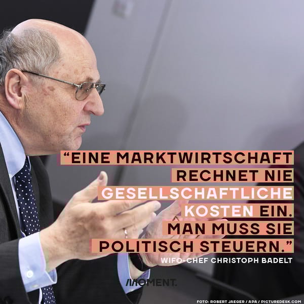 Der Chef des Wirtschaftsforschungsinstituts (WIFO) Christoph Badelt sagt im aktuellen "Profil", dass der Markt politisch gesteuert werden müsse. Die Marktwirtschaft (sagt der überzeugte Marktwirtschafter) würde nämlich gesellschaftliche Kosten bei ihren Preisen nie berücksichtigen. Also zum Beispiel, was es für Menschen bedeutet und für den Staat kostet, wenn die Umwelt munter zerstört wird. Deshalb wäre etwa das Fliegen so billig, obwohl es für die Allgemeinheit hohe Folgekosten hat. Badelt ist deshalb für eine CO2-Besteuerung im Kampf gegen die Klimakrise.