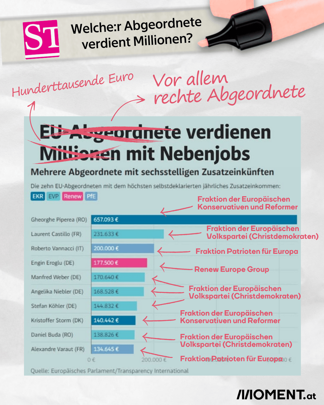Was im Standard-Post auf Sozialen Medien am ersten Blick ungesehen bleibt: Das betrifft nicht alle EU-Abgeordneten gleich. Vor allem liberale, konservative und rechtsextreme Politiker:innen haben besonders hohe Nebeneinkünfte. Unter den 10 Top-"Nebenverdiener:innen" sind neun Konservativ bis Rechtsextreme sowie ein liberaler Politiker. Von 720 Abgeordneten haben lediglich 216 Nebeneinkünfte gemeldet, meist sind sie nicht besonders hoch. Zusammen kommen sie auf 6,3 Millionen Euro im Jahr.