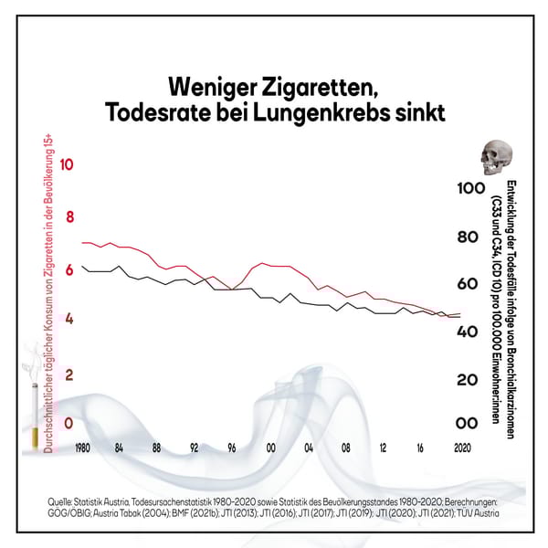 Kauften die Einwohner:innen Österreichs 1980 im Schnitt noch mehr als 7 Zigaretten pro Tag, waren es im Jahr 2020 weniger als 5. Im gleichen Zeitraum sank die Zahl der Personen, die an Lungenkrebs starben: von mehr als 60 pro Hunderttausend Einwohner:innen auf rund 45.