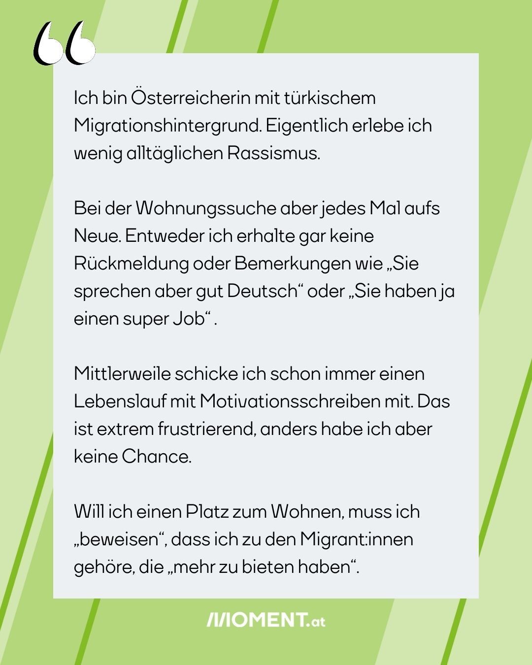 Eigentlich gibt es davor Schutz durch das Gleichbehandlungsgesetz. Das verbietet, dass Personen bei der Wohnungssuche zum Beispiel aufgrund der ethnischen Zugehörigkeit diskriminiert werden. In der Praxis ändert das aber wenig. Um das Problem aufzuzeigen, haben wir unsere Community nach Erfahrungsberichten gefragt. Hier ein Auszug der Zuschriften, die wir bekommen haben.